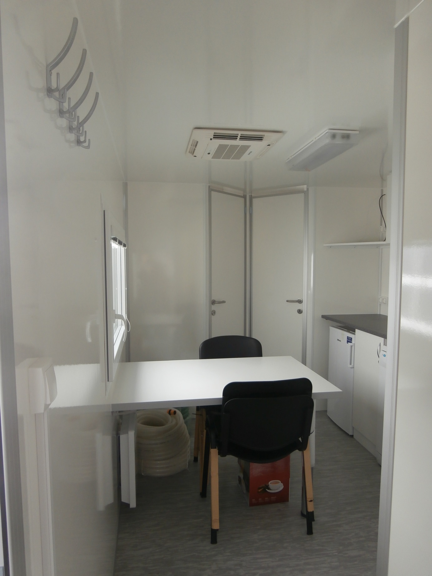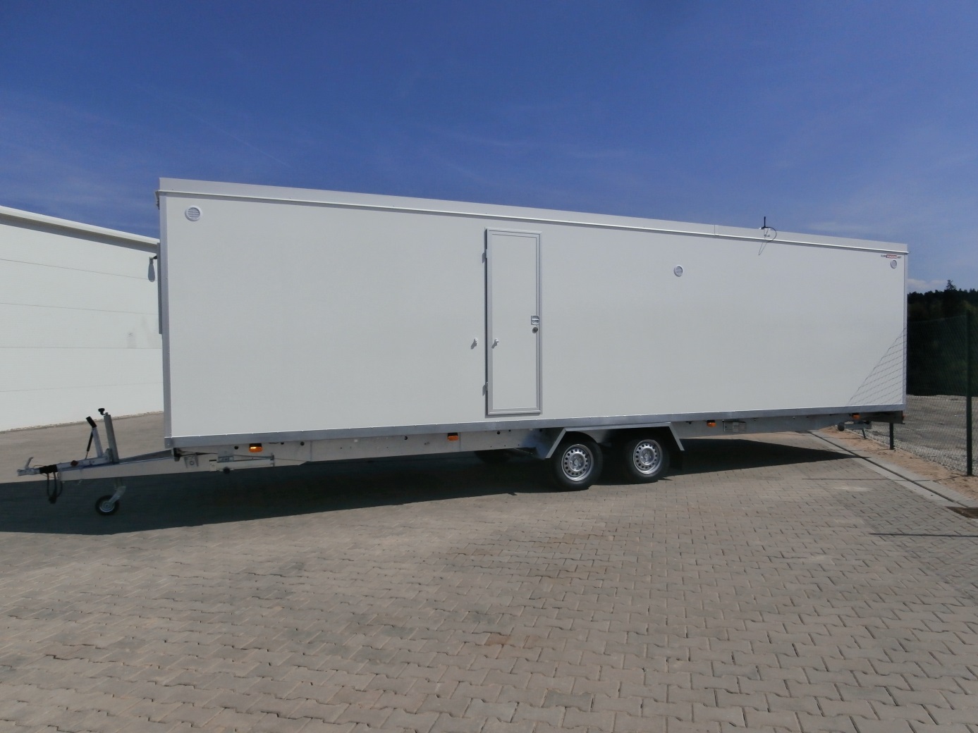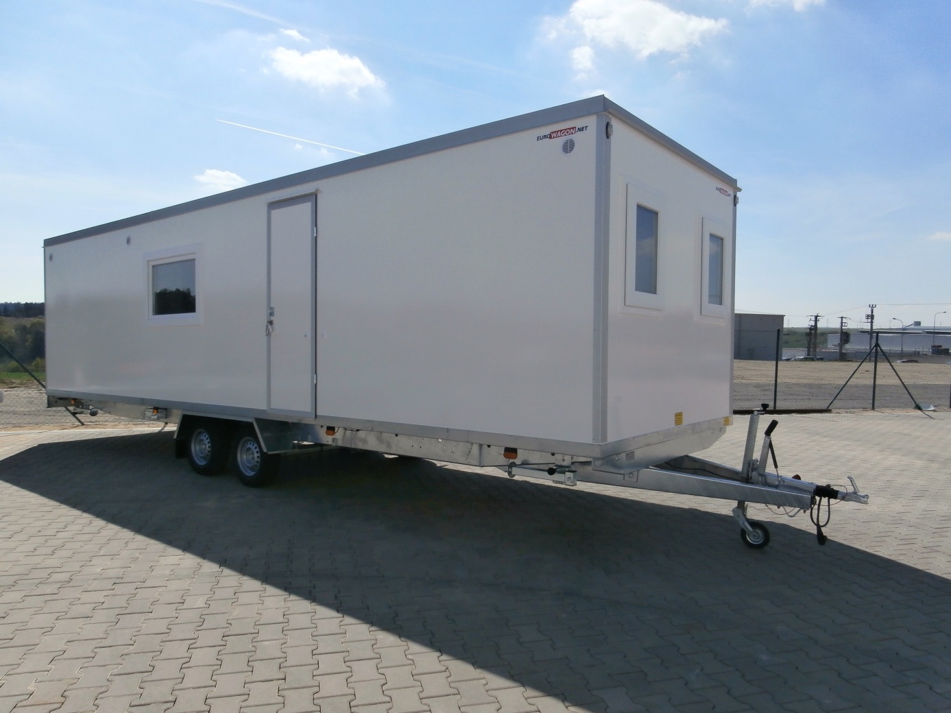 Elektricky vytápěná mobilní obytná buňka pro čtyři osoby – vybavená kuchyňkou s příslušenstvím (myčka, odsavač, varná deska, lednice, kávovar, 19" TV), čtyřmi samostatnými ložnicemi s postelemi, toaletou, sprchou a umyvadlem včetně zrcadla.