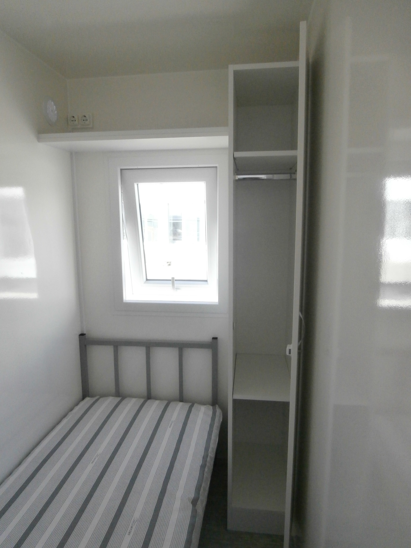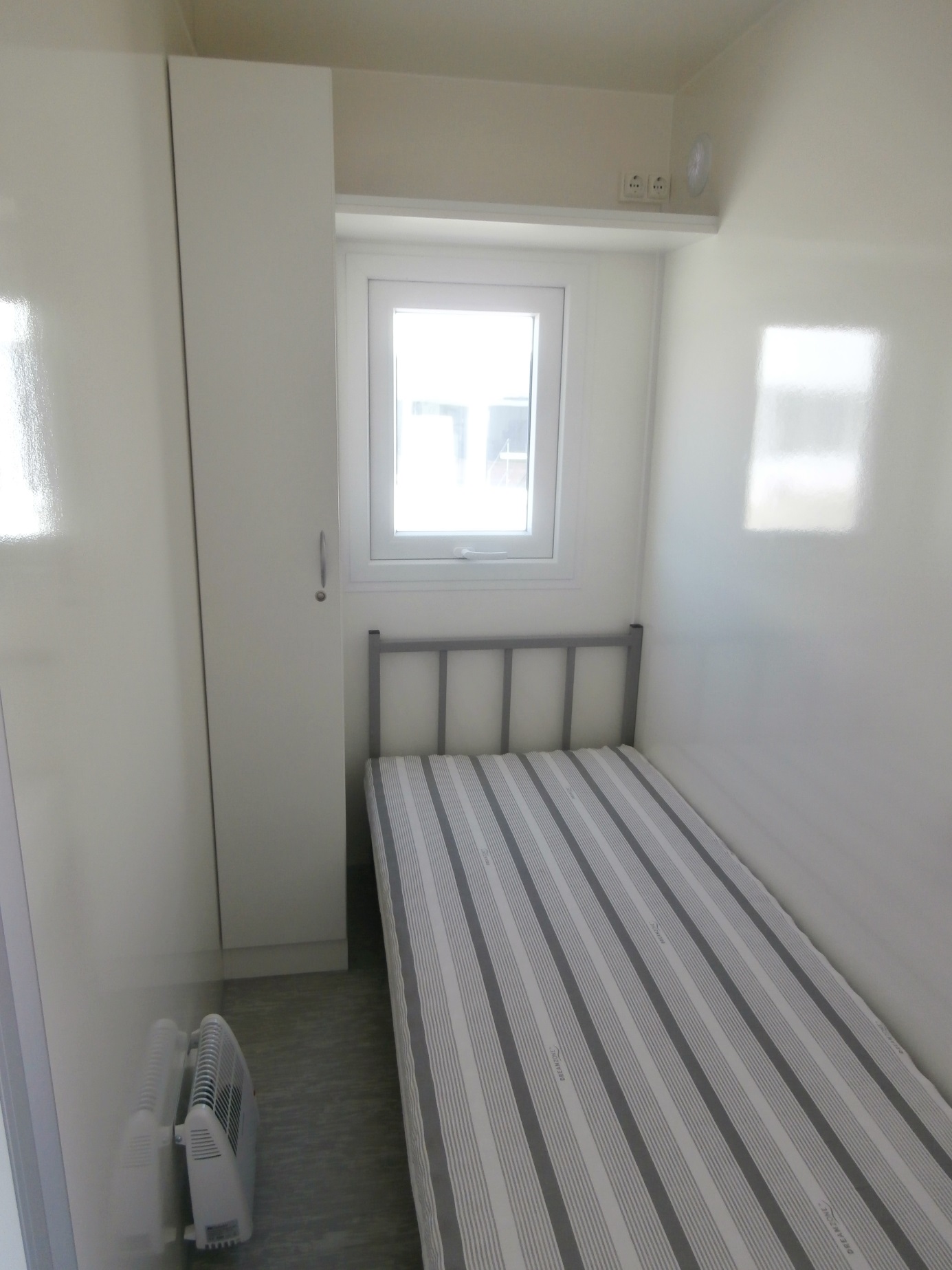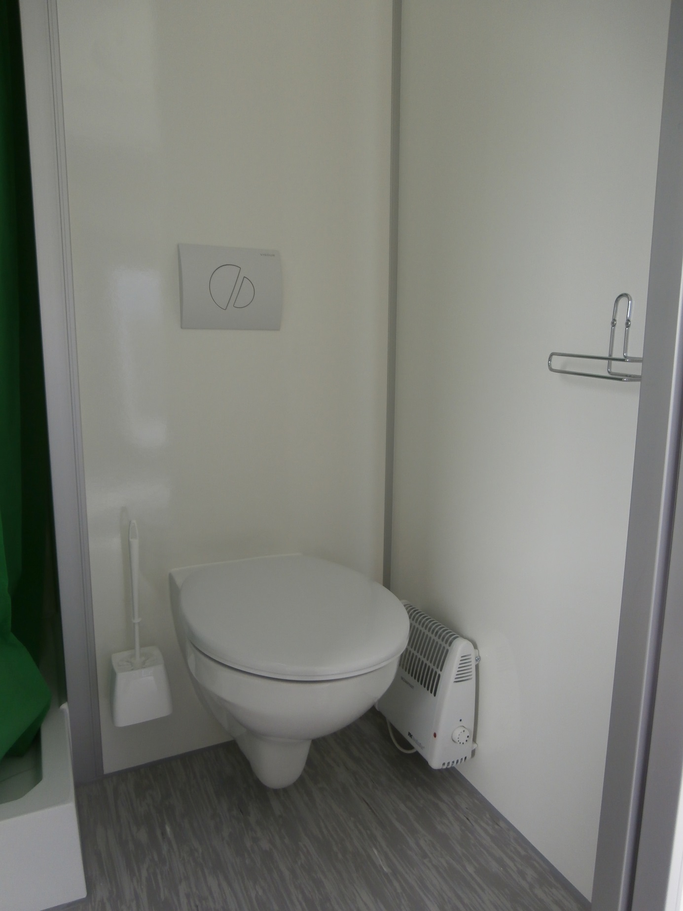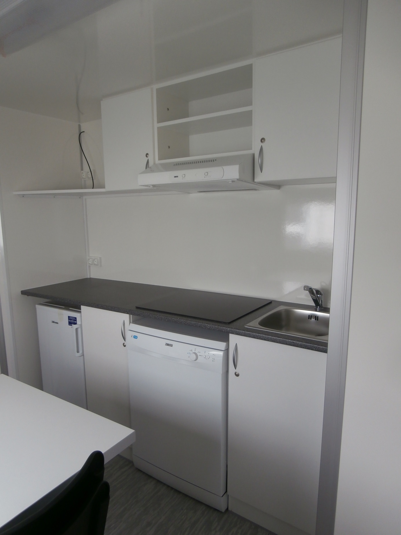 Elektricky vytápěná mobilní obytná buňka pro čtyři osoby – vybavená kuchyňkou s příslušenstvím (myčka, odsavač, varná deska, lednice, kávovar, 19" TV), čtyřmi samostatnými ložnicemi s postelemi, toaletou, sprchou a umyvadlem včetně zrcadla.