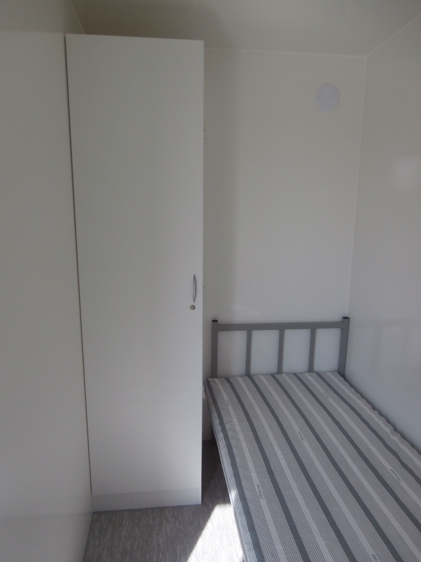 Elektricky vytápěná mobilní obytná buňka pro 2-4 osoby – vybavená kuchyňkou s příslušenstvím (myčka, odsavač, varná deska, lednice, kávovar, 19" TV), dvěma ložnicemi s poschoďovými postelemi, toaletou, sprchou a umyvadlem včetně zrcadla.