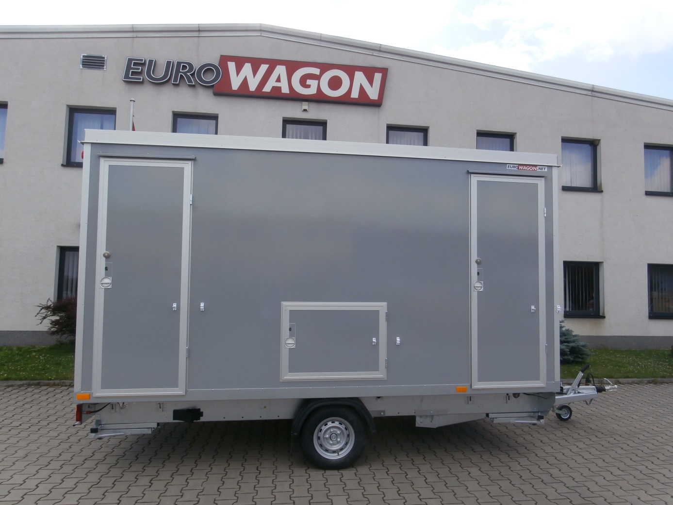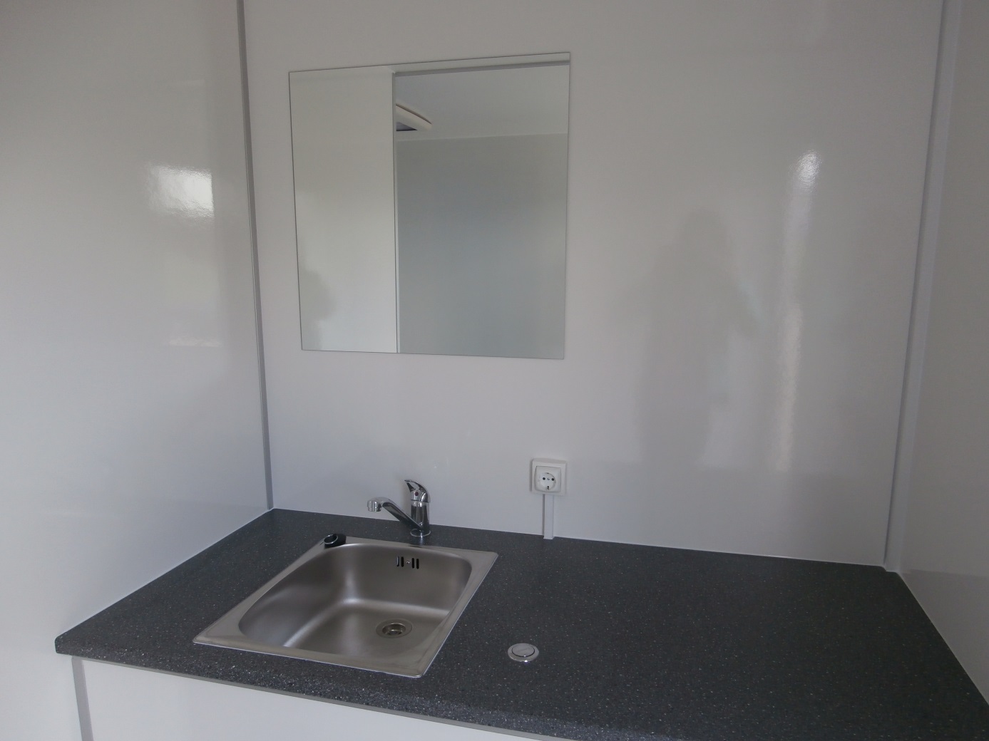 2 x mobiles Badezimmer, ausgestattet mit Toilette, Dusche, Waschbecken mit Spiegel, Schrank.