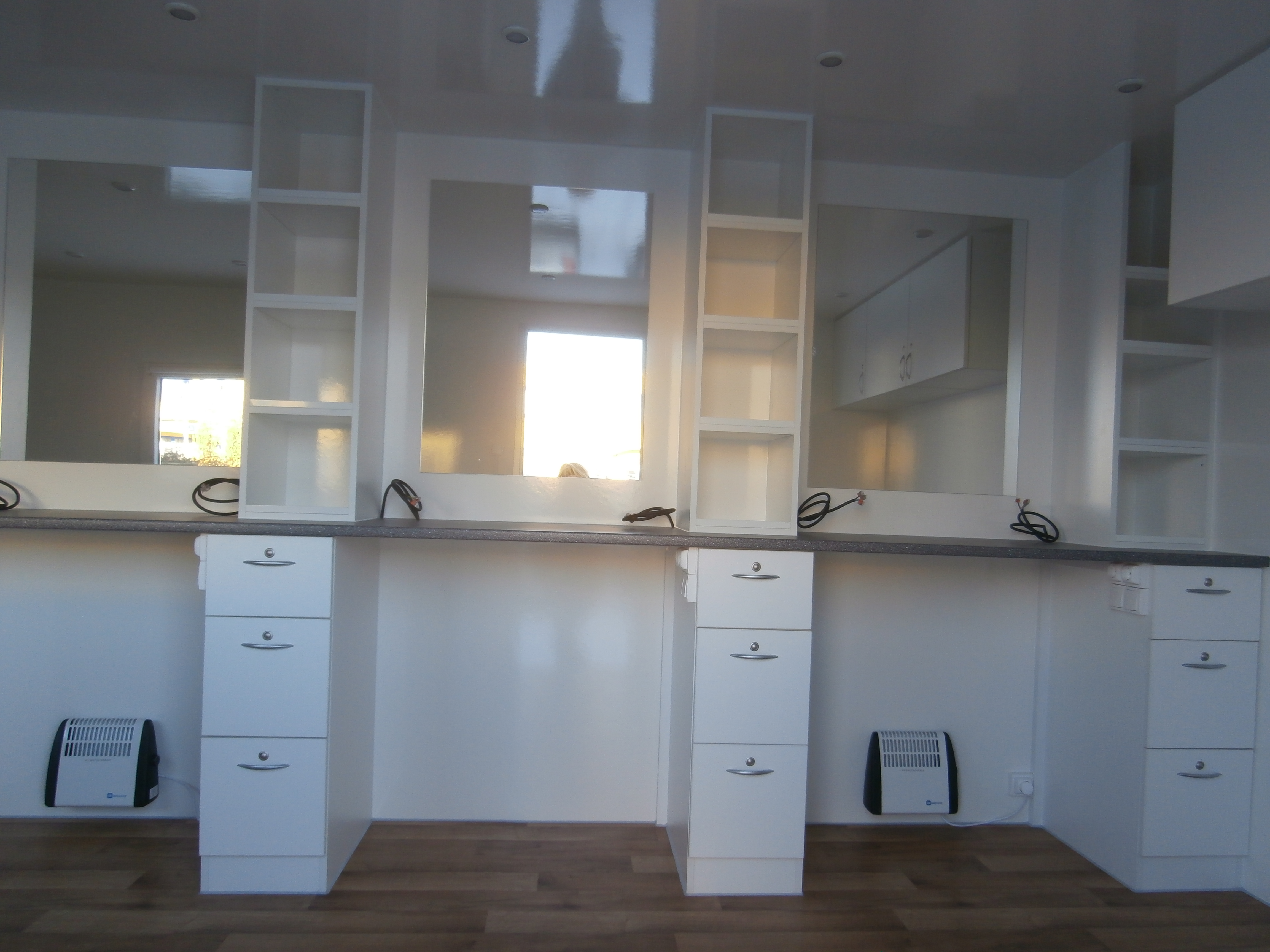 Mobilmaskenraum mit Maskenpulten, Regalen, Schränken, Schubladen, Kleiderstangen, Waschbecken, ...