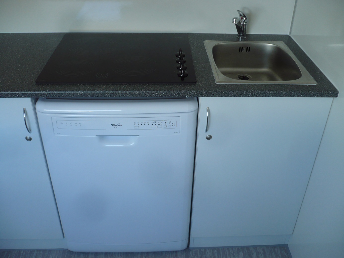 Elektrisch beheizte Wohnwagen für zwei Personen, ausgestattet mit Küchenzeile (Geschirrspülmaschine, Abzugshaube, Kochplatte, Kühlschrank, Kaffeemaschine, 19" Fernseher), 2 x Schlafzimmer mit Einzelbetten, Badezimmer mit Toilette, Dusche und Waschbecken mit Spiegel.