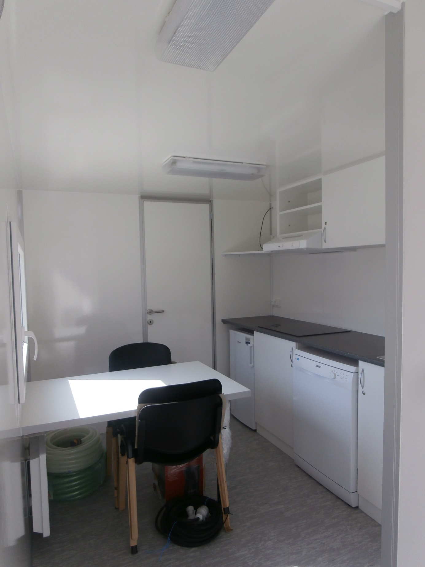 Elektrisch beheizte Wohnwagen für drei Personen, ausgestattet mit Küchenzeile (Geschirrspülmaschine, Abzugshaube, Kochplatte, Kühlschrank, Kaffeemaschine, 19" Fernseher), 3 x Schlafzimmer mit Einzelbetten, Badezimmer mit Toilette, Dusche und Waschbecken mit Spiegel.